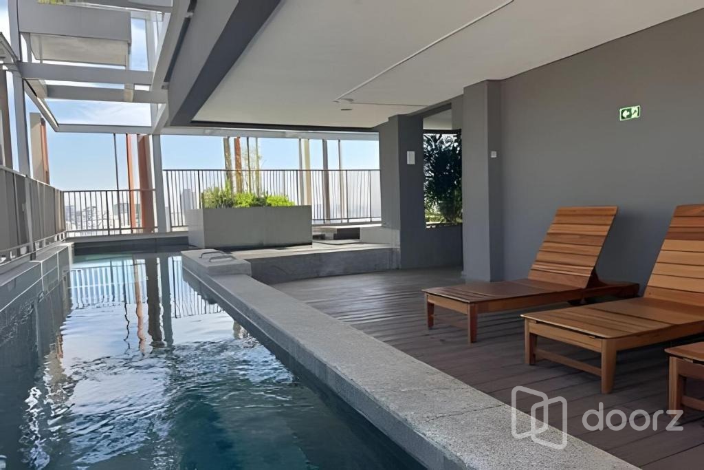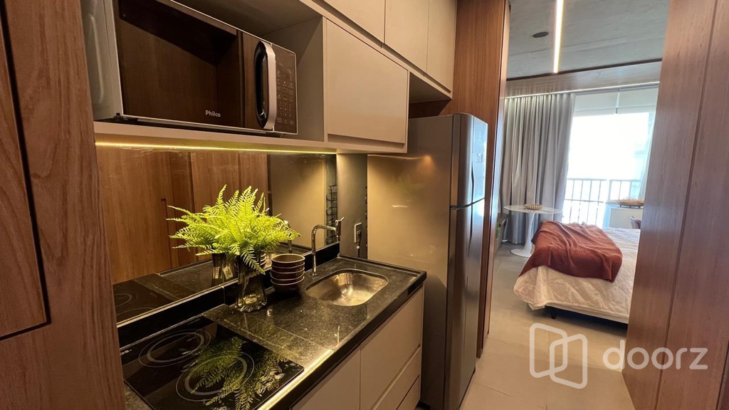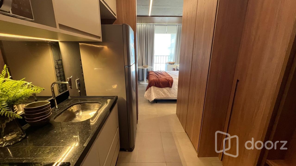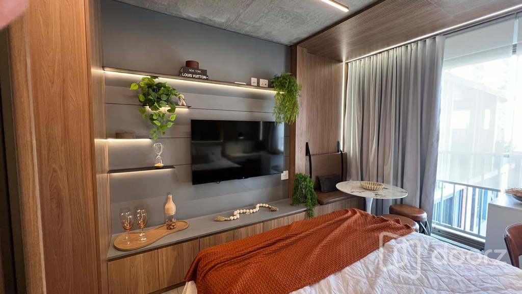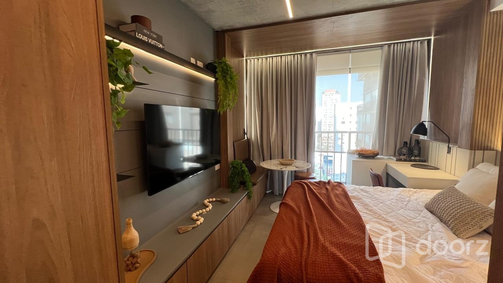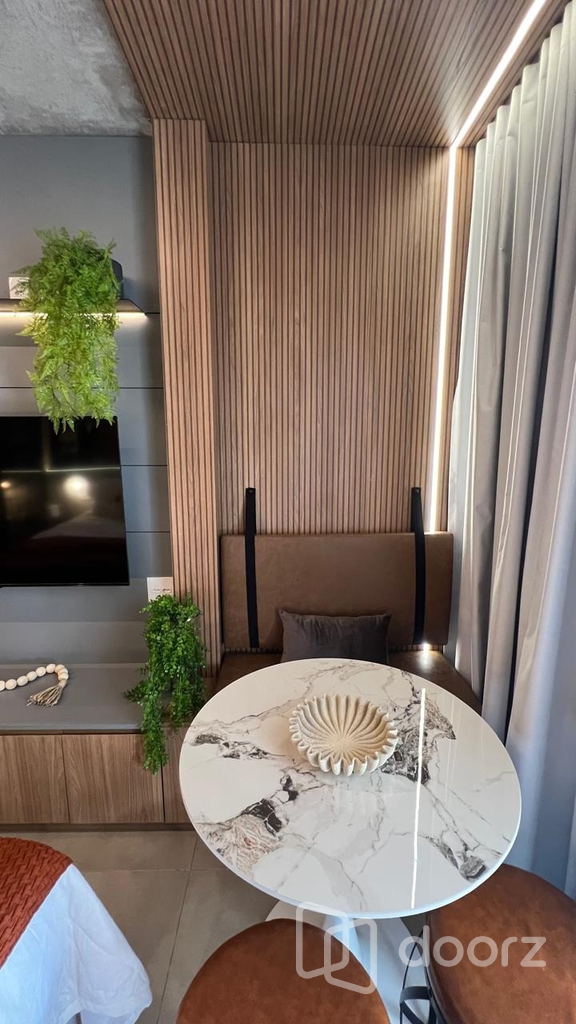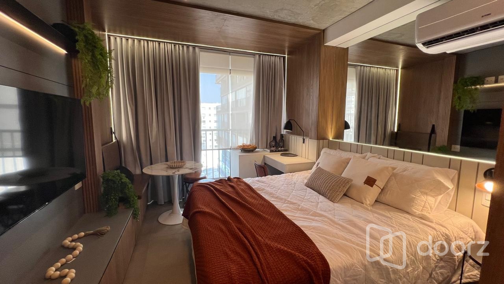 Studio 1 dormitório mobiliado e decorado com a sofisticação. Alto padrão de acabamento e excelente aproveitamento de espaço. Projeto sofisticado com marcenaria planejada, detalhes em madeira e pedra, iluminação estratégica e ar-condicionado split.