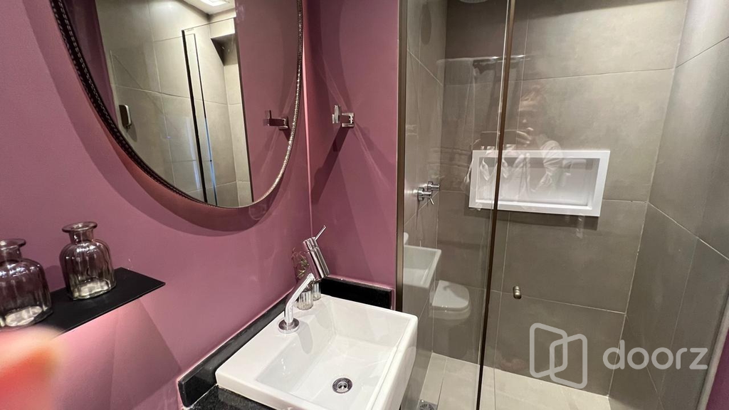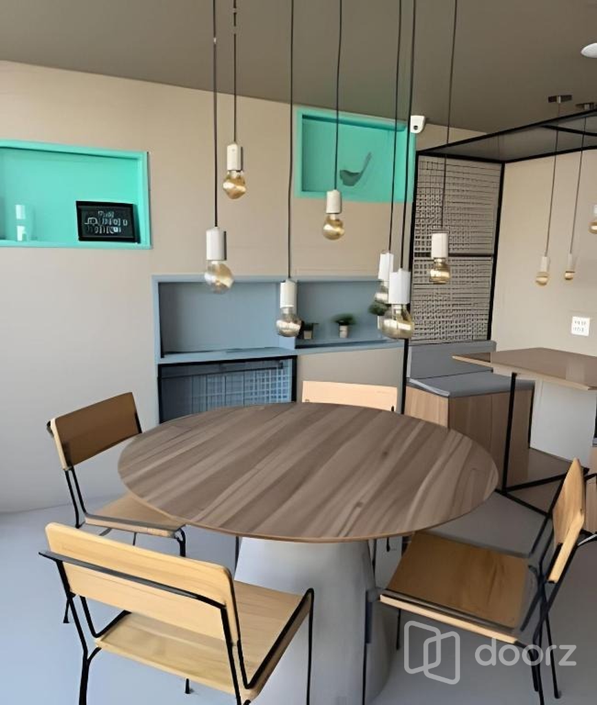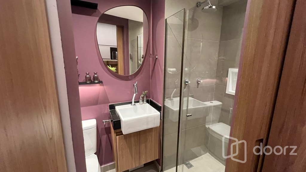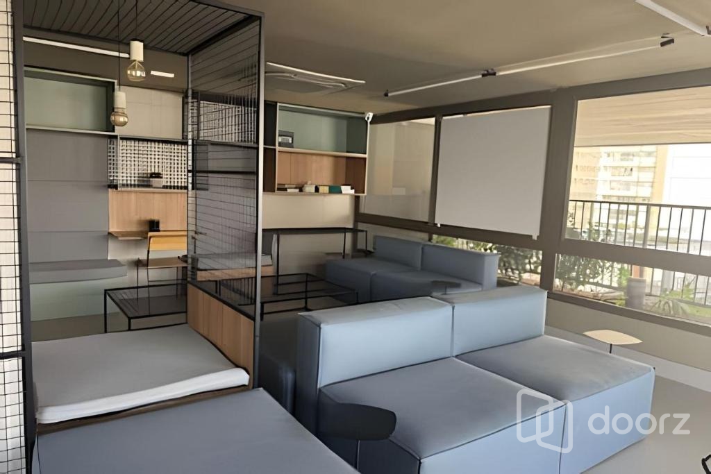 O imóvel será entregue como nas fotos: dormitório completo, estação de trabalho integrada e espaço para refeições. Cozinha planejada equipada com eletrodomésticos e banheiro moderno com box de vidro e nicho embutido.